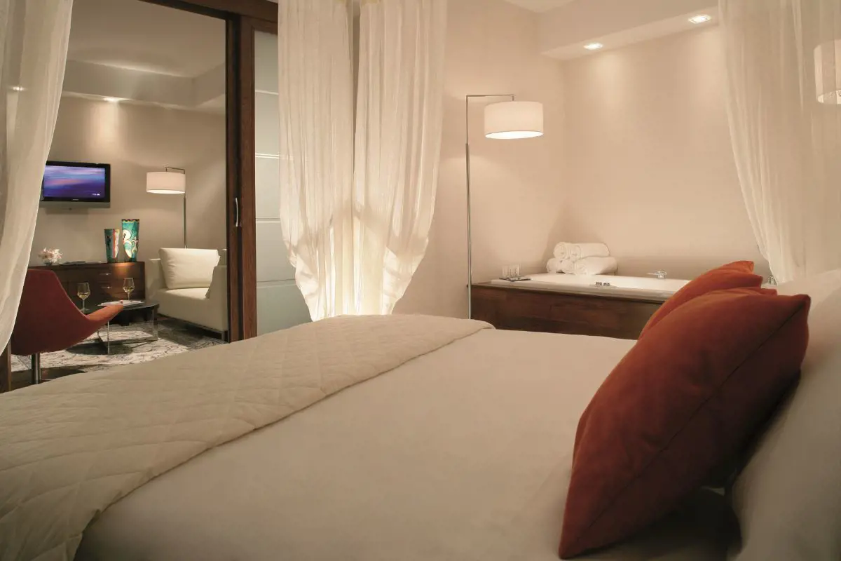 The Seiren Suite is an elegant oasis of luxury, featuring a bedroom with a canopy, indoor Jacuzzi and private bathroom with a crescent-shaped shower.