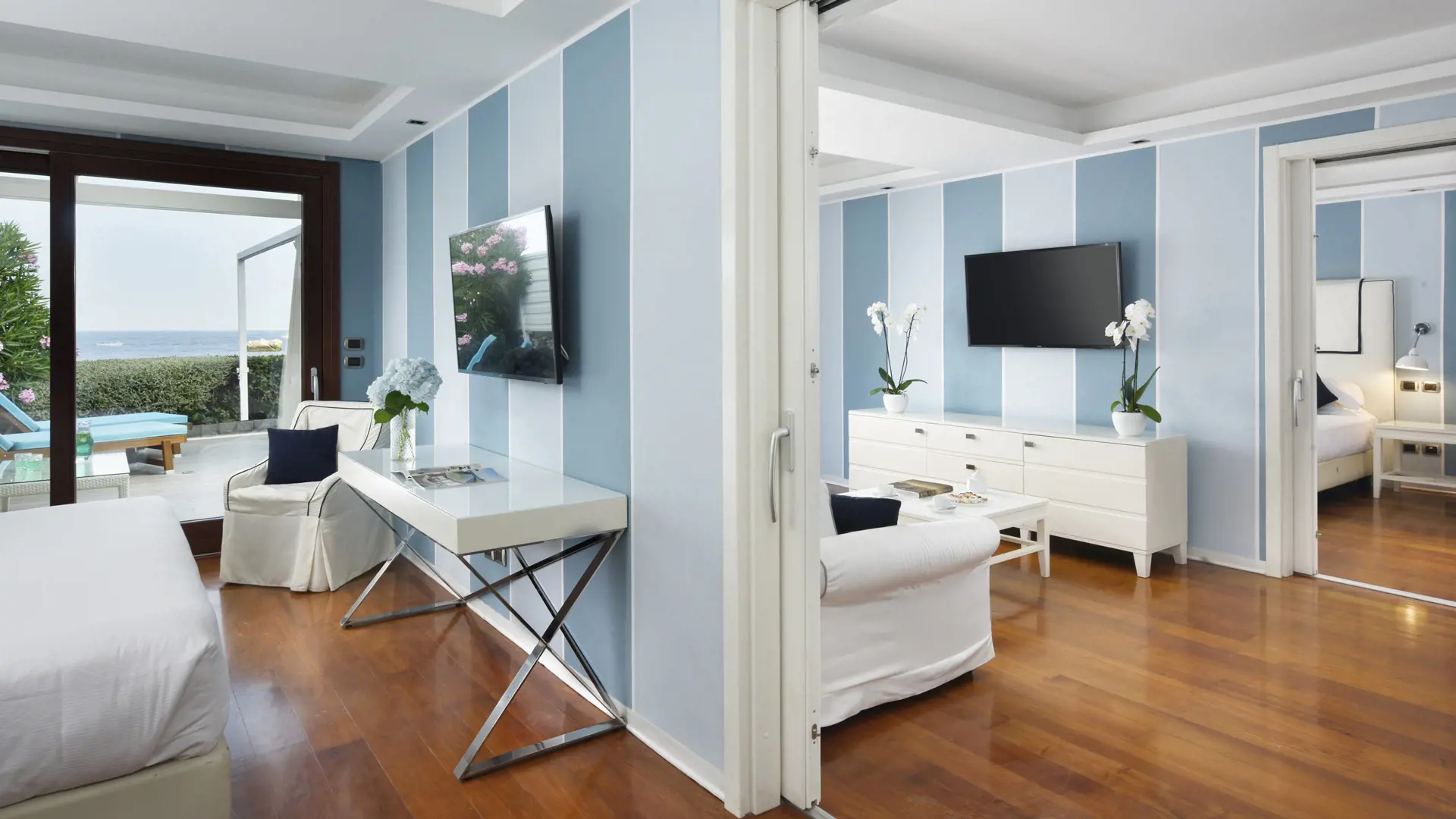 Panoramiche, spaziose e luminose, le Suite Vista Mare sono situate in un piano privato rialzato con balconcini esterni da cui si può godere di una splendida vista mare su Isola Bella.
